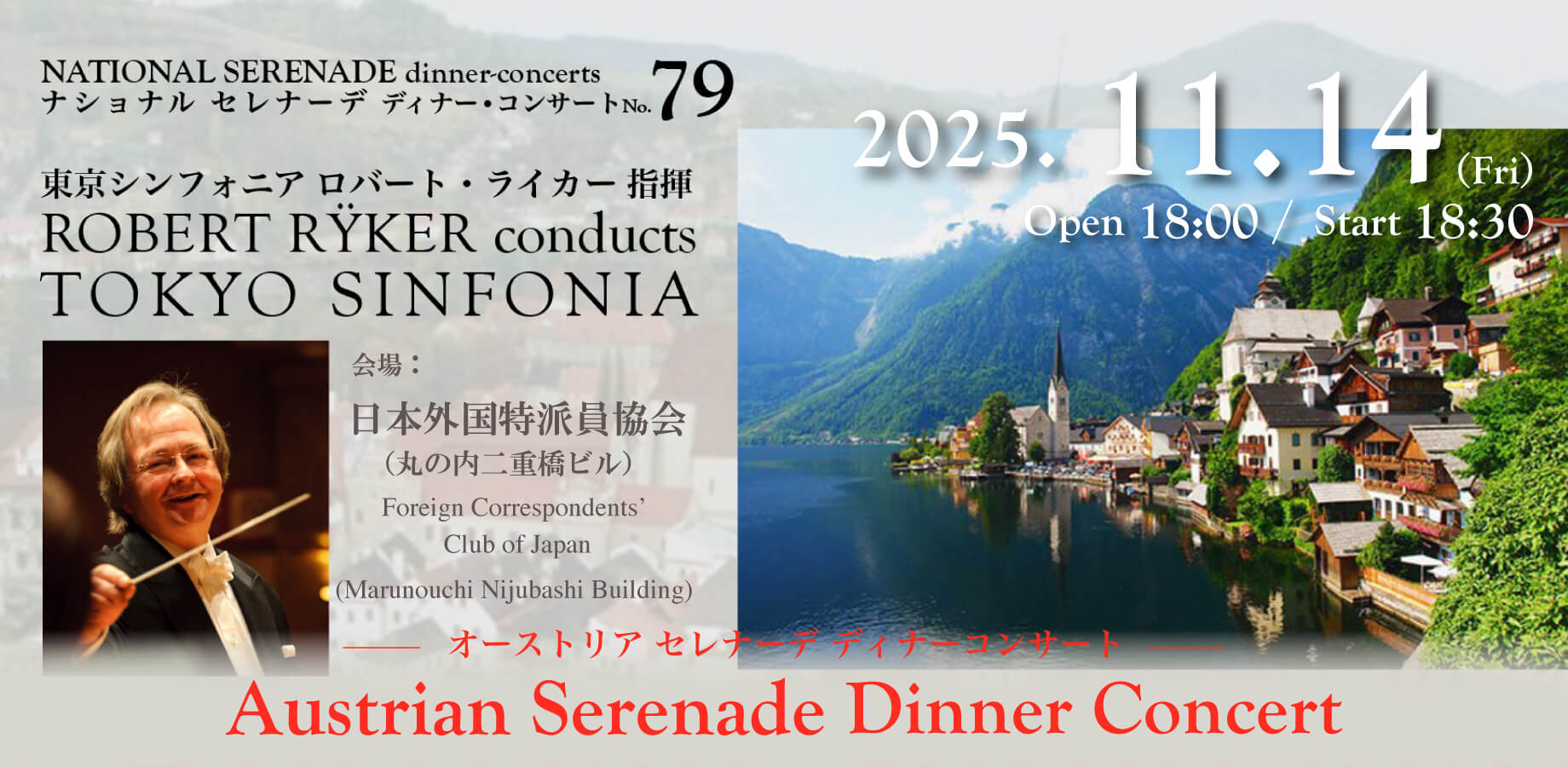 最新のコンサート情報 オーストリア セレナーデ ディナーコンサート 11月14日(金)午後6時30分 日本外国特派員協会(FCCJ) チケットはこちらから <今後のコンサート>12/17(水)フォーレ セレナーデ11/14(金)オーストリア セレナーデ ディナーコンサート 銀座王子ホール公演・学生特別割引 学生特別割引料金は、1,000円です。 大学生から小学生まで、王子ホールコンサートに限ってのご提供です。未就学のお子さんもご入場可能です。社会人の学生さんは受付で学生証をご提示願います。ホールでのオーケストラの生演奏をぜひ経験してください。音楽で心を豊かに。 年間演奏スケジュール 【定期公演】 弦楽のための交響曲シリーズ: 作曲家がテーマ 銀座王子ホール シンフォニアプラスシリーズ: 国際的ソリストと共演 銀座王子ホール ディナーコンサートシリーズ: 国がテーマのディナー&コンサート 日本外国特派員協会 【スペシャルイベント】 企業記念イベント 大使館コンサート 学校出張コンサート ご予約・お問い合わせ お電話またはメールにて事務局までお問い合わせください TEL : (03) 3588 0738 tickets@tokyosinfonia.com 【お振込み先】三井住友銀行 赤坂支店 普通預金 9819543特定非営利活動法人東京シンフォニア Peatixでチケット購入する