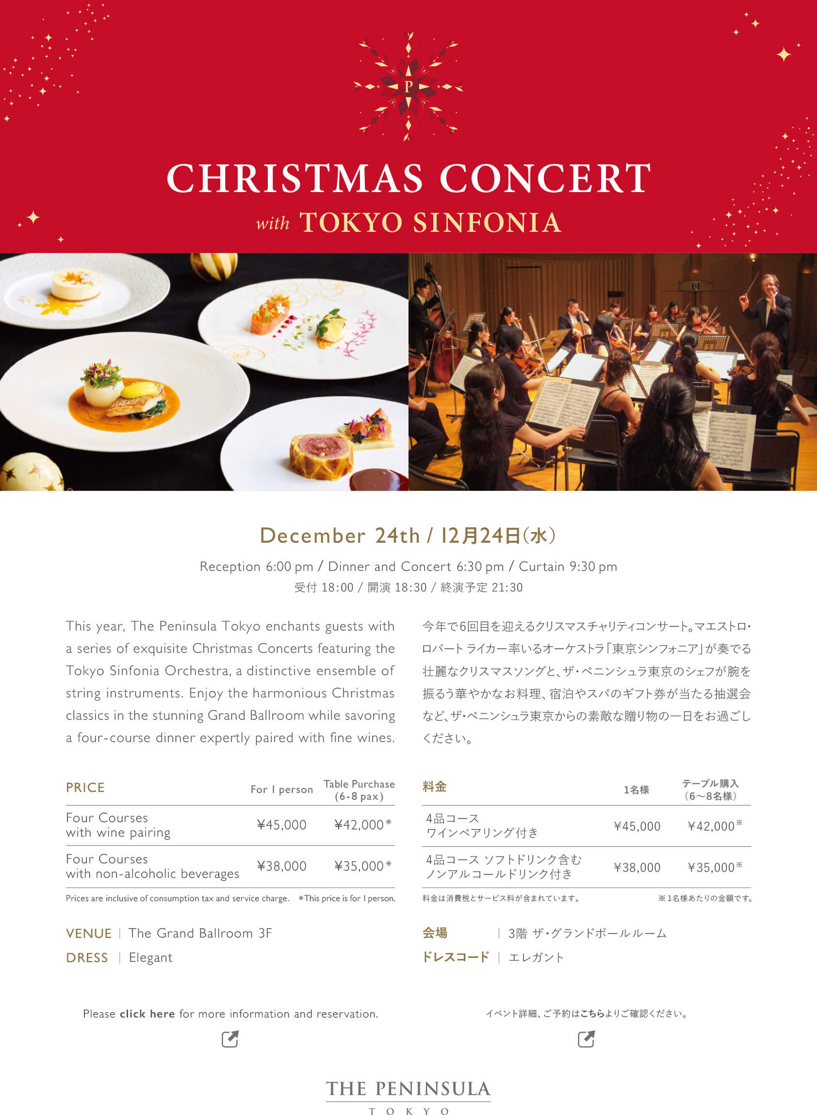 Now in its sixth year, this Christmas Concert has become a beloved seasonal tradition. It will be held on Christmas Eve at The Peninsula Tokyo.